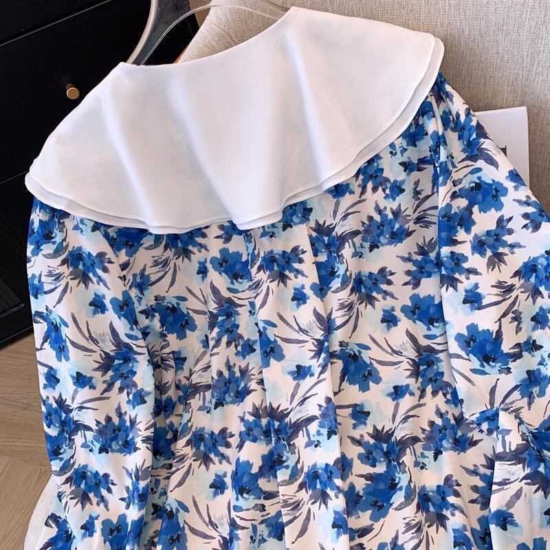 大きいサイズ トップス 襟付き レディース 春夏 新品 長袖 ブルー 花柄