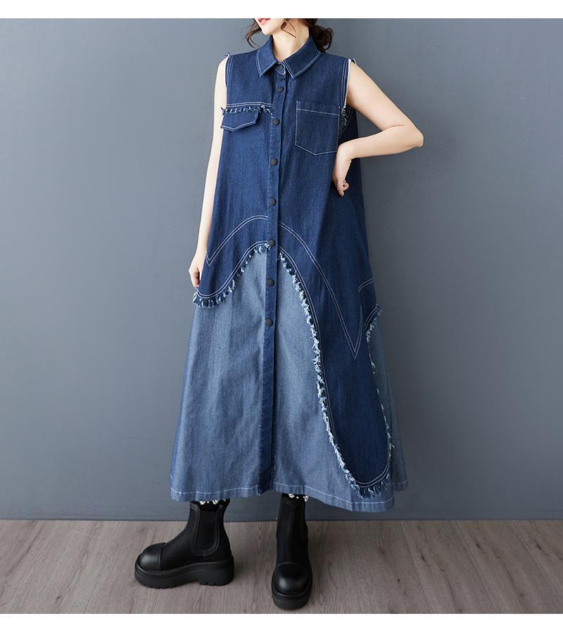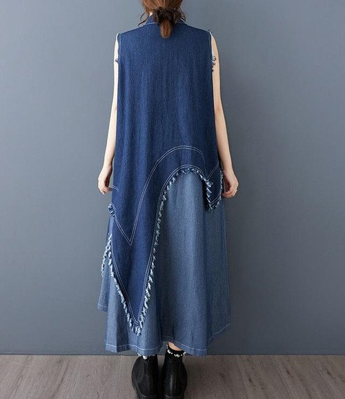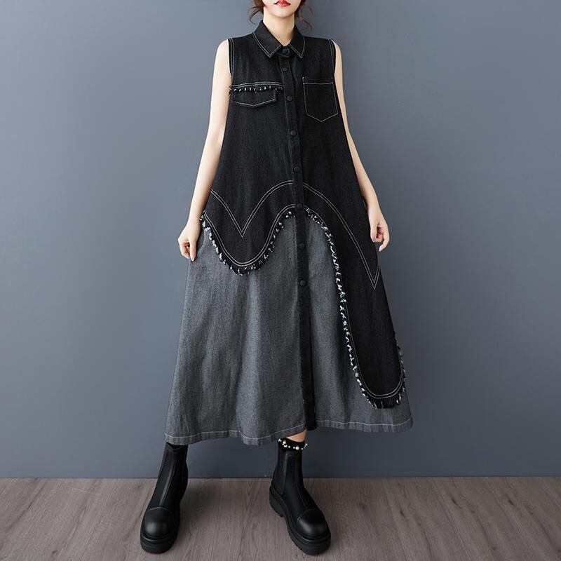 大きいサイズ デニム ワンピース ノースリーブ レディース 春夏 新品 ロング 秋 ブラック ポケット付き 袖なし
