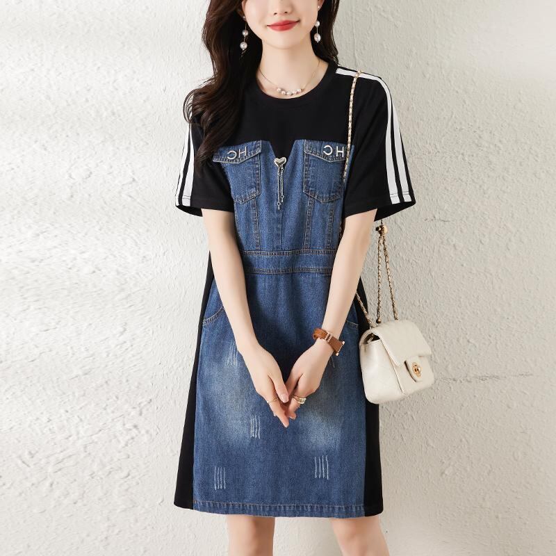 大きいサイズ デニム ワンピース ハート レディース 春夏 新品 半袖 異素材 重ね着風