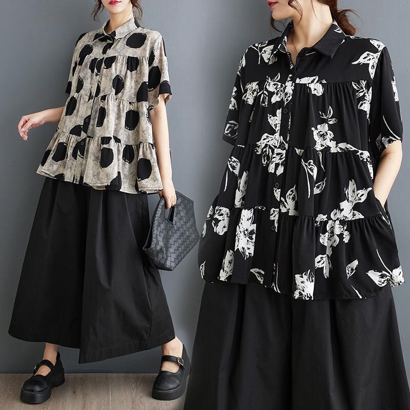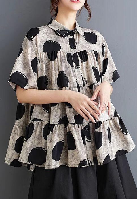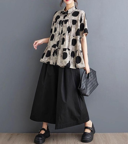 大きいサイズ トップス チュニック レディース 春夏 新品 半袖 モード系 ふんわり水玉 ドット シャツ Aライン前ボタン 個性 グレージュ