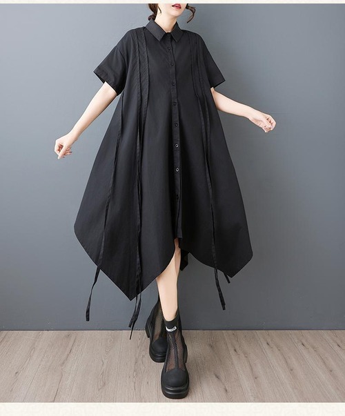 大きいサイズ イレギュラー ワンピース レディース 春夏 新品 半袖 変形裾 ブラック シャツ