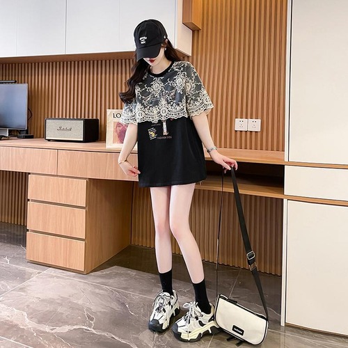 春夏にぴったりの大きいサイズ 半袖Tシャツが新登場です!可愛らしいレースが施されたデザインは、ガーリーな雰囲気を演出し、さまざまなシーンで活躍します。ブラックとグレーの2色展開で、どんなスタイルにもマッチします☆