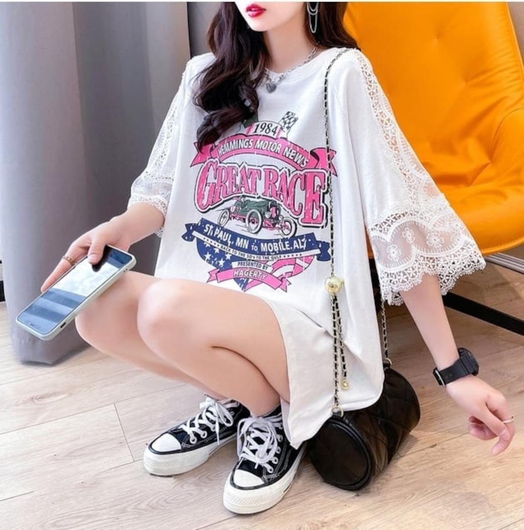 春夏シーズンにぴったりな大きいサイズのトップスが登場です!ピンクのレース袖が女性らしさを引き立て、オーバーサイズのシルエットがリラックスした着心地を実現します。肌見せデザインがポイントで、華やかな印象を与えてくれる一枚です☆