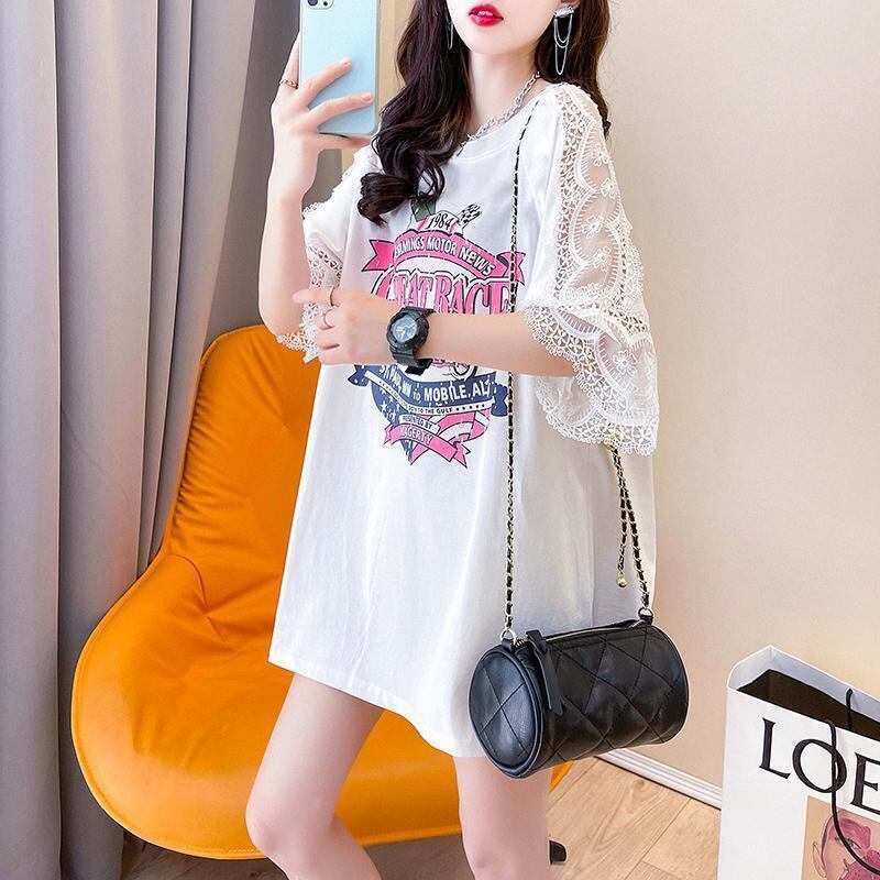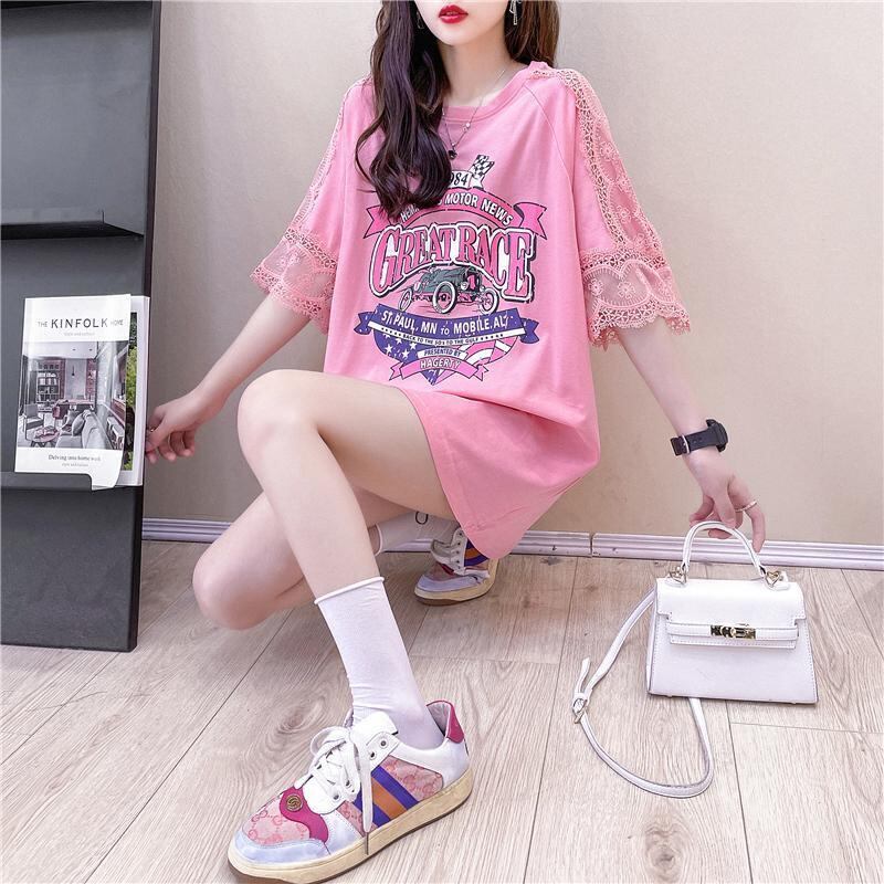 大きいサイズ トップス レース袖 レディース 春夏 新品 Tシャツ 五分袖 ピンク オーバーサイズ 肌見せ