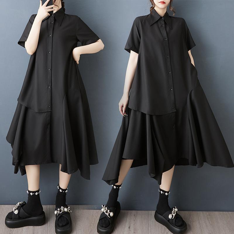 春夏のカジュアルスタイルにぴったりな、大きいサイズのイレギュラー ワンピースが新登場です!特徴的な変形デザインが魅力で、シンプルながらも個性的なスタイルを演出します。半袖のシャツタイプで、涼しげな着心地を実現。ブラックのシックな色合いが、あなたの魅力を引き立てます☆
