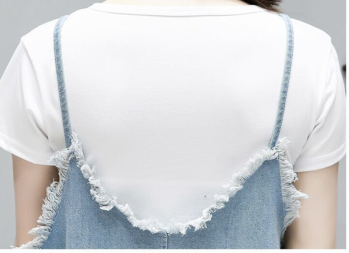 大きいサイズ レディース Tシャツ&デニムキャミワンピース 2点セット フリンジダメージ 半袖 春夏 切りっぱなし ジャンスカ