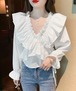レディース マルチウェイ リボンショート丈ブラウス 韓国風大人可愛い Vネック薄手ブラウス着やせフェミニン クロスフリル