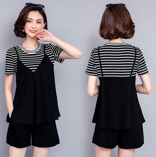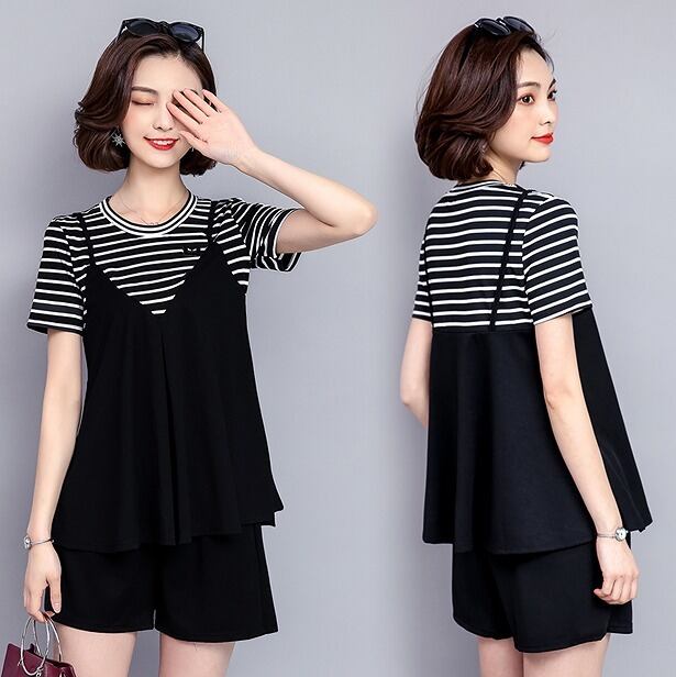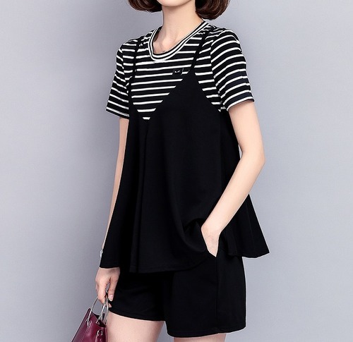 レディス マタニティ 婦人服 ゆったり 大きめ フリーサイズ 韓国 送料無料 春夏 着痩せ 新作 おおきいさいず 重ね着風トップス&ショートパンツ2点セット ボーダー