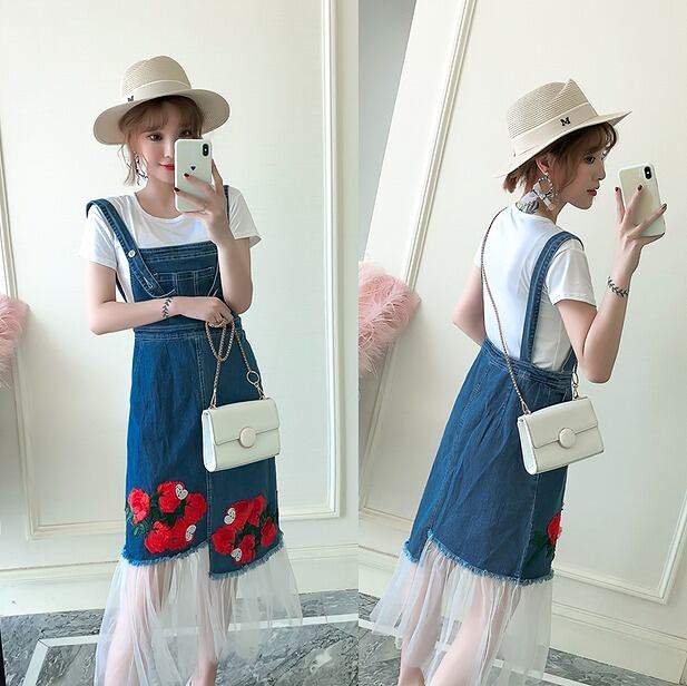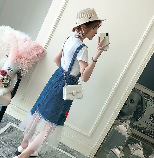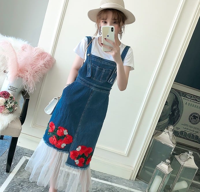 大きいサイズ レディース 花柄チュール裾デニムサロペットワンピース ジャンスカ ジャンパースカート 異素材 春夏