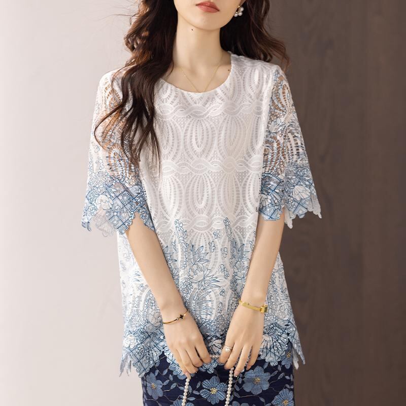 大きいサイズ トップス シャツ ブルー レース レディース 春夏 新品 半袖