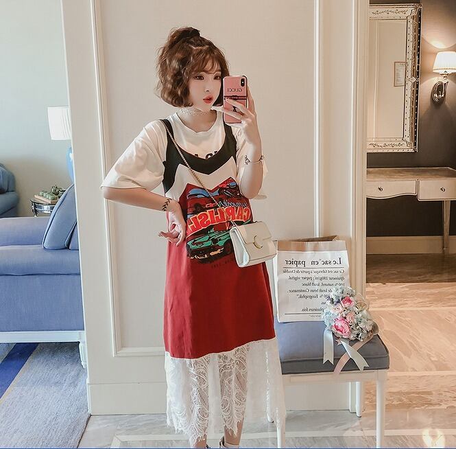 大きいサイズ レディース 胸プリントサロペットワンピース 裾レース 春夏