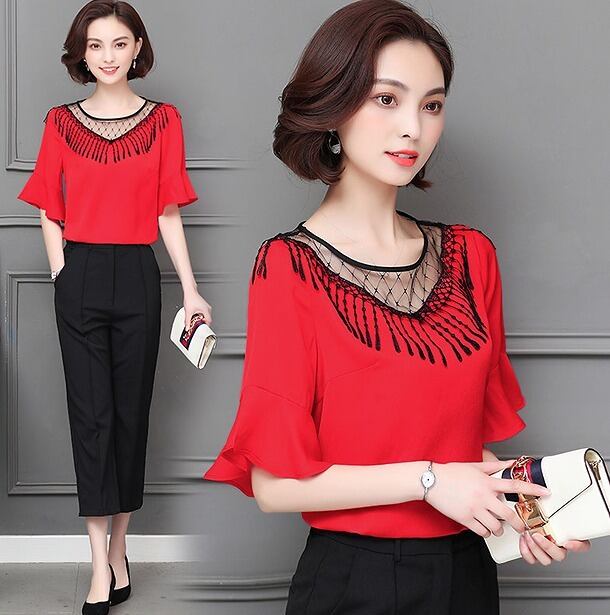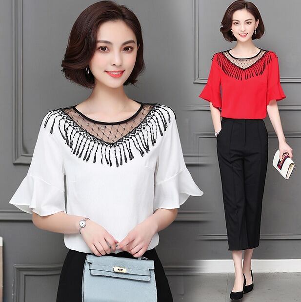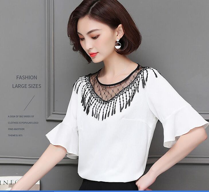レディス マタニティ 婦人服 ゆったり 大きめ フリーサイズ 韓国 送料無料 春夏 着痩せ 新作 おおきいさいず デコルテシースルーフリンジトップス フレア袖 半袖 五分袖