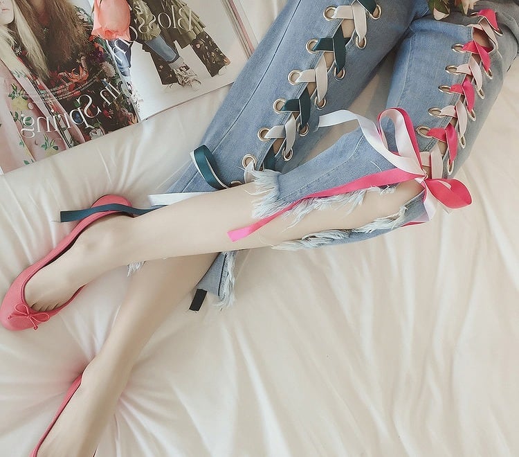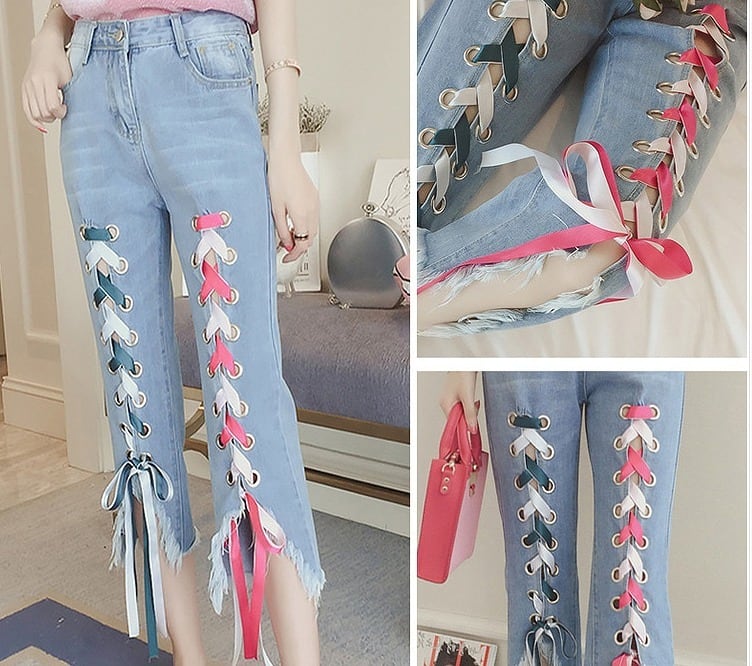 L~大きいサイズ レディース ダメージデニムクロップドパンツ ジーンズ リボンデザイン