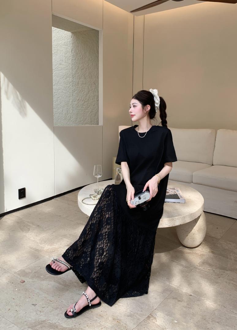 新品 夏 ゆったり レース切替 マキシ丈ワンピース 黒 大きいサイズ3XL