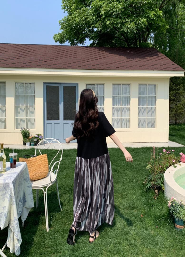 上身頃はシンプルな黒のカットソー素材、スカート部分は動きのあるプリーツのようなデザインで、一枚でコーディネートが決まります。