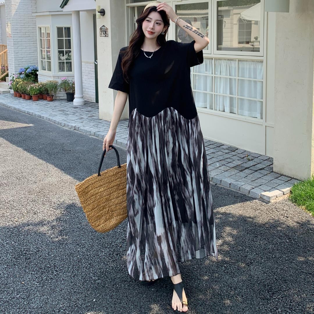 大きいサイズ夏服ゆったり半袖 切替ロングワンピース楽ちん体型カバー
