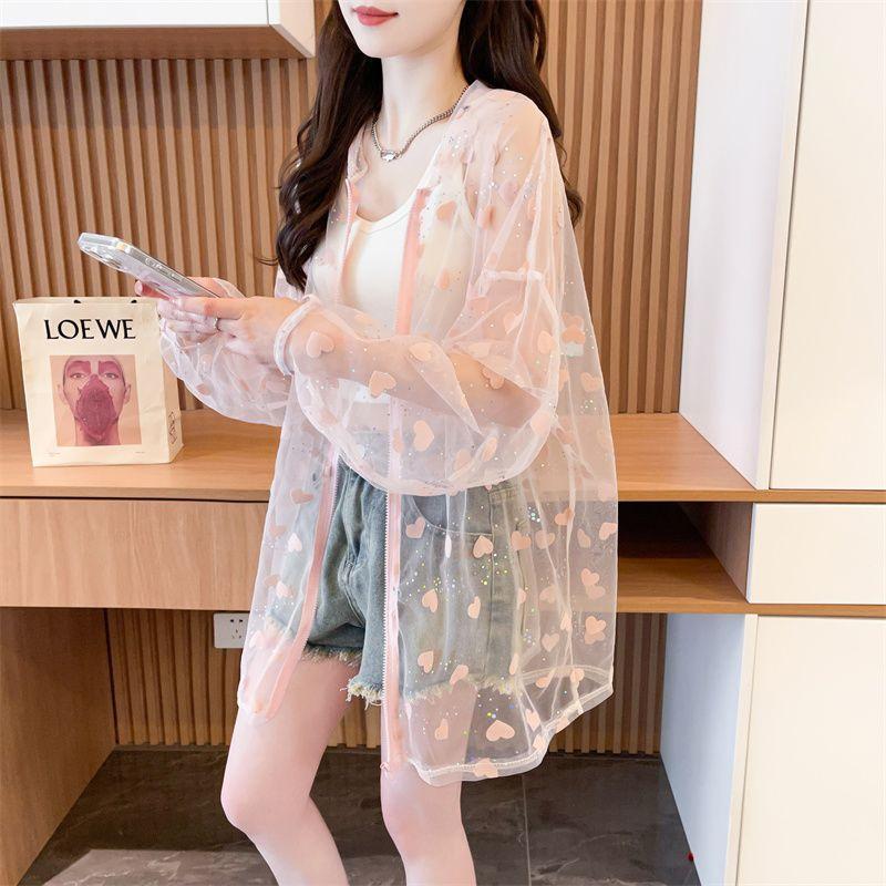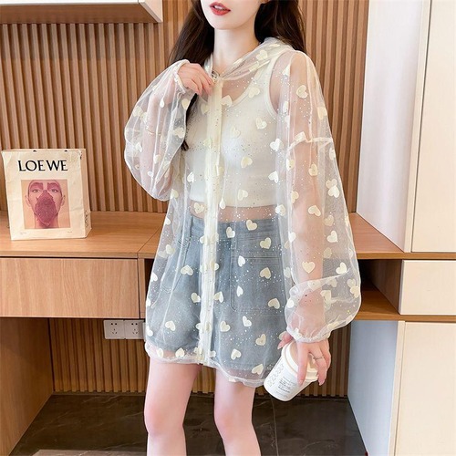 ハート柄が可愛いシースルーパーカーです。夏の紫外線対策や冷房対策にぴったりです。