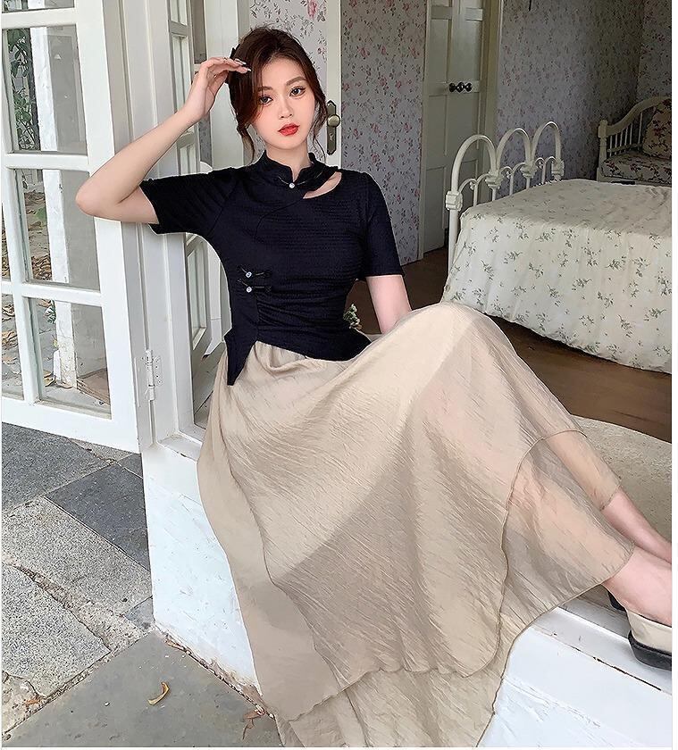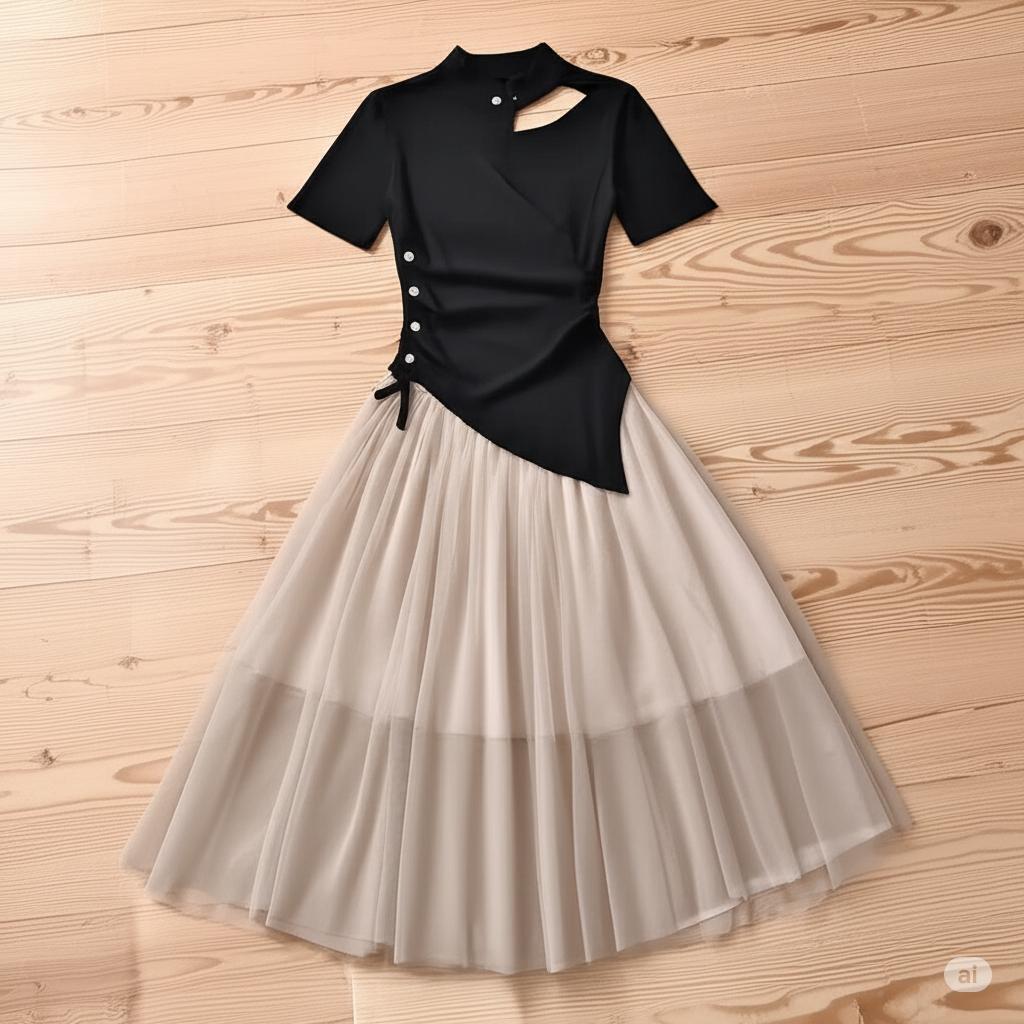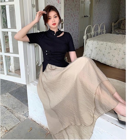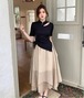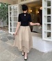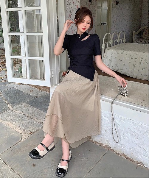 アシンメトリーデザインが目を引くトップスと、ふんわりシフォンが美しいスカートのセットアップです。別々に着用することもでき、着回し力抜群!大人の女性らしい上品さとトレンド感を兼ね備えた一着です。