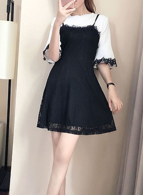 大きいサイズ レディース ベルスリーブ透かし柄キャミ重ね着風ワンピース 半袖 五分袖 春夏
