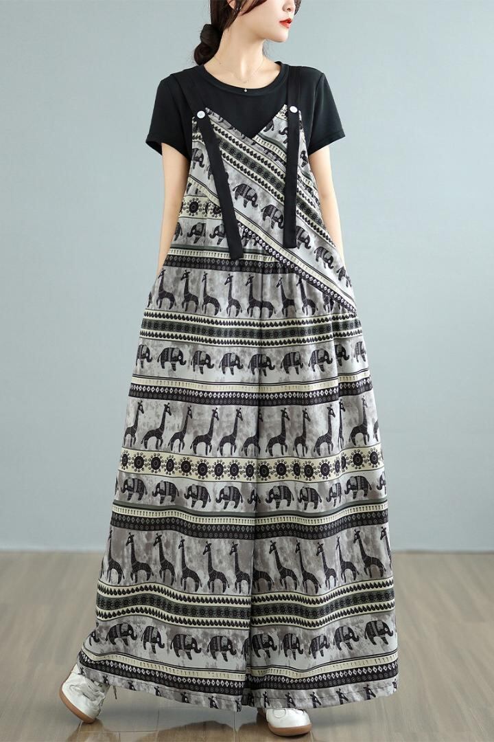 大きいサイズ ゆったりサロペットパンツ アニマル柄ワイドパンツ