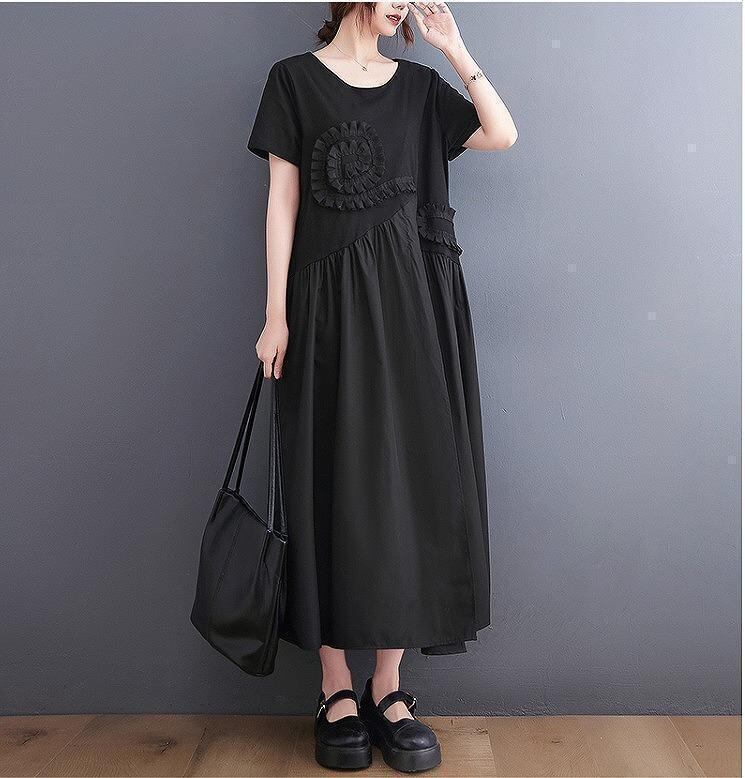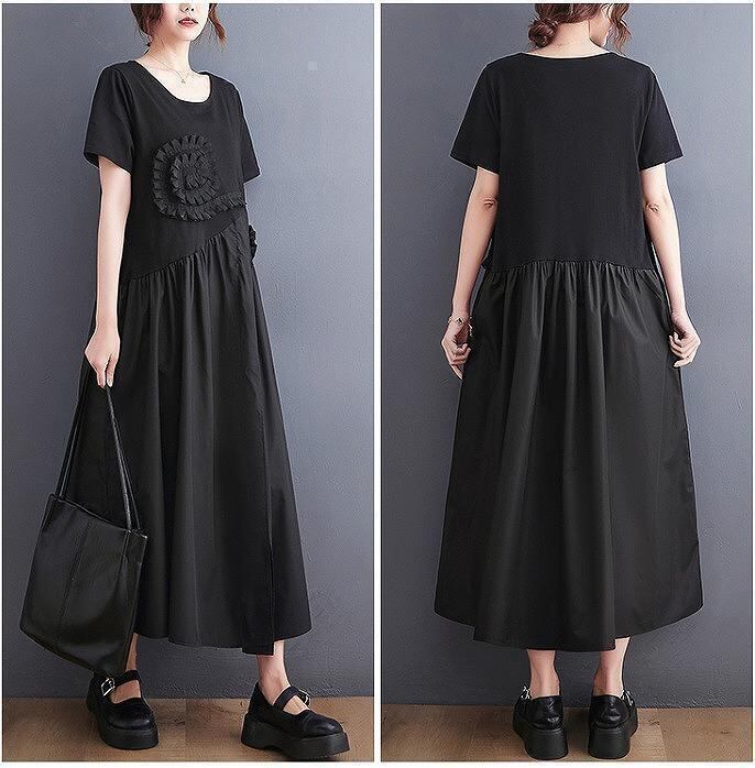 【即日発送】大きいサイズ 3Lレディース 春夏 ロング 黒系 ワンピースゆったり半袖
