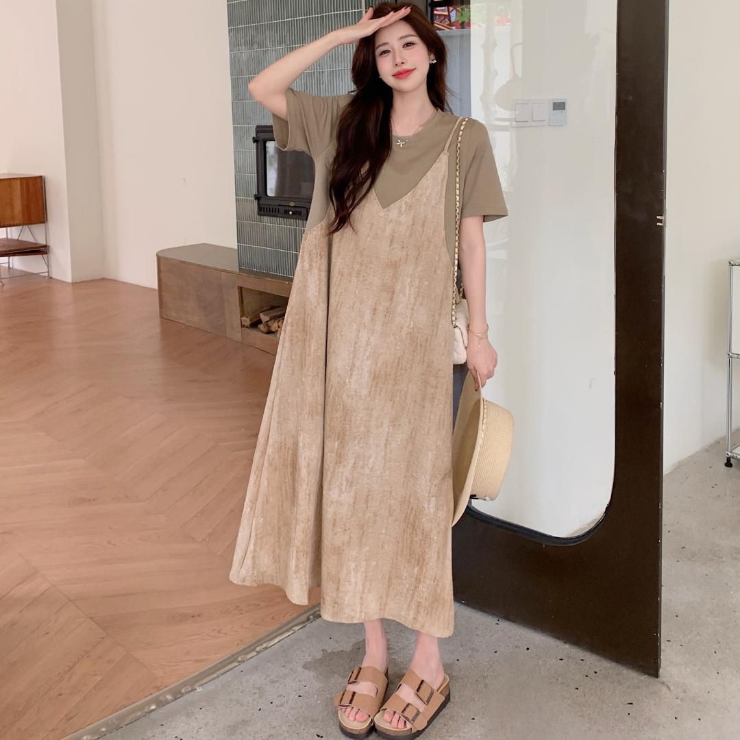 新品 大きいサイズ 重ね着風 ゆったり ワンピース Tシャツ夏秋 4L半袖