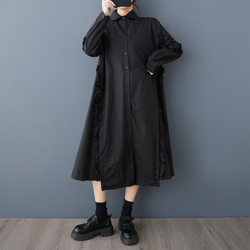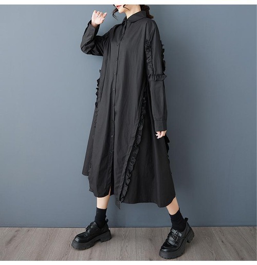新品 大きいサイズ フリル シャツワンピース ゆったり 黒 春秋冬 ロング 長袖