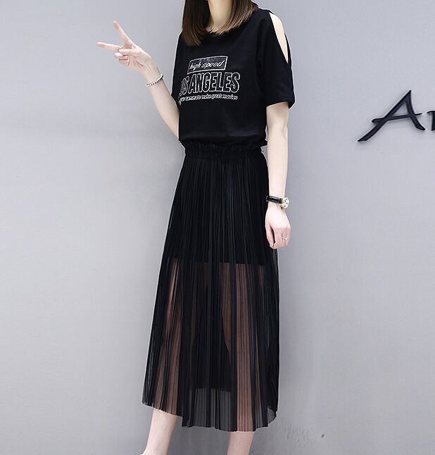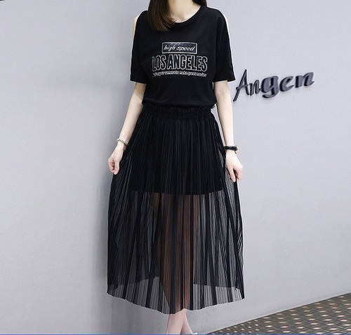 大きいサイズ レディース オープンショルダーミニワンピース&チュールスカート 2点セット 重ね着 半袖 五分袖 春夏