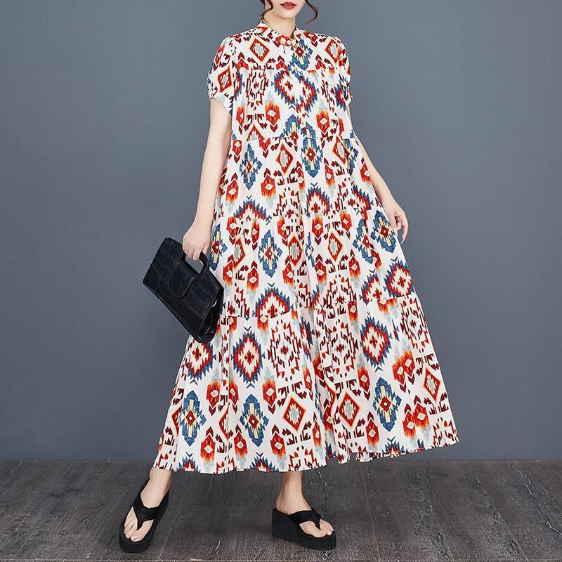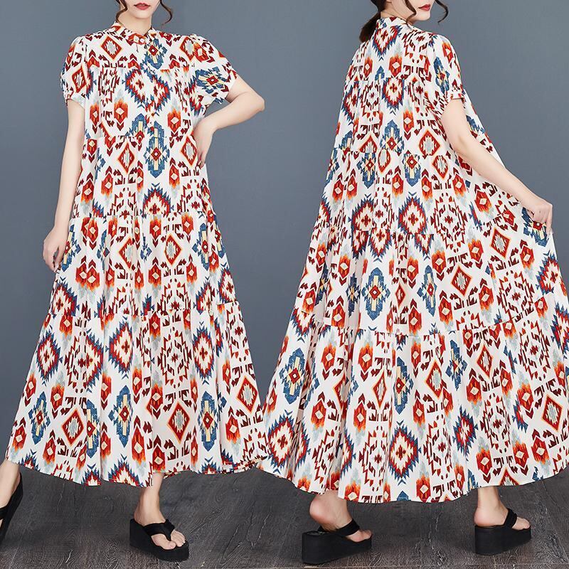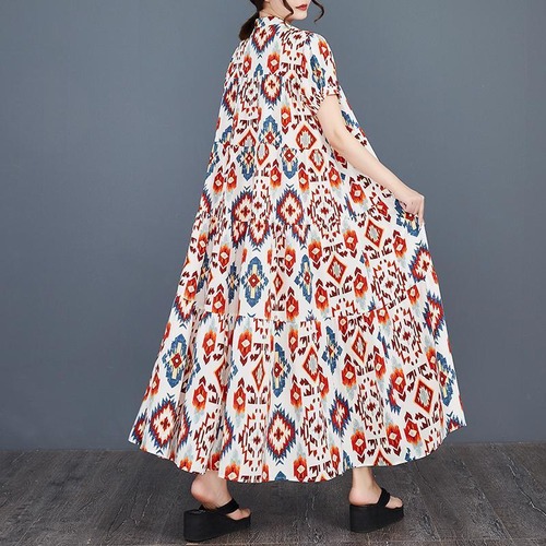 【大きいサイズ】新品夏物 レディース ティアードワンピース 半袖民族風柄 ロング ゆったり マキシ丈 シャツ