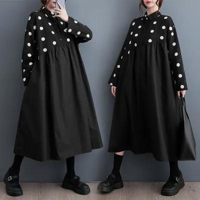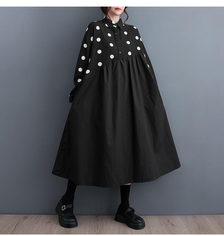 【即納】大きいサイズ ドット柄ロングワンピース ゆったり 体型カバー秋冬長袖 レディース
