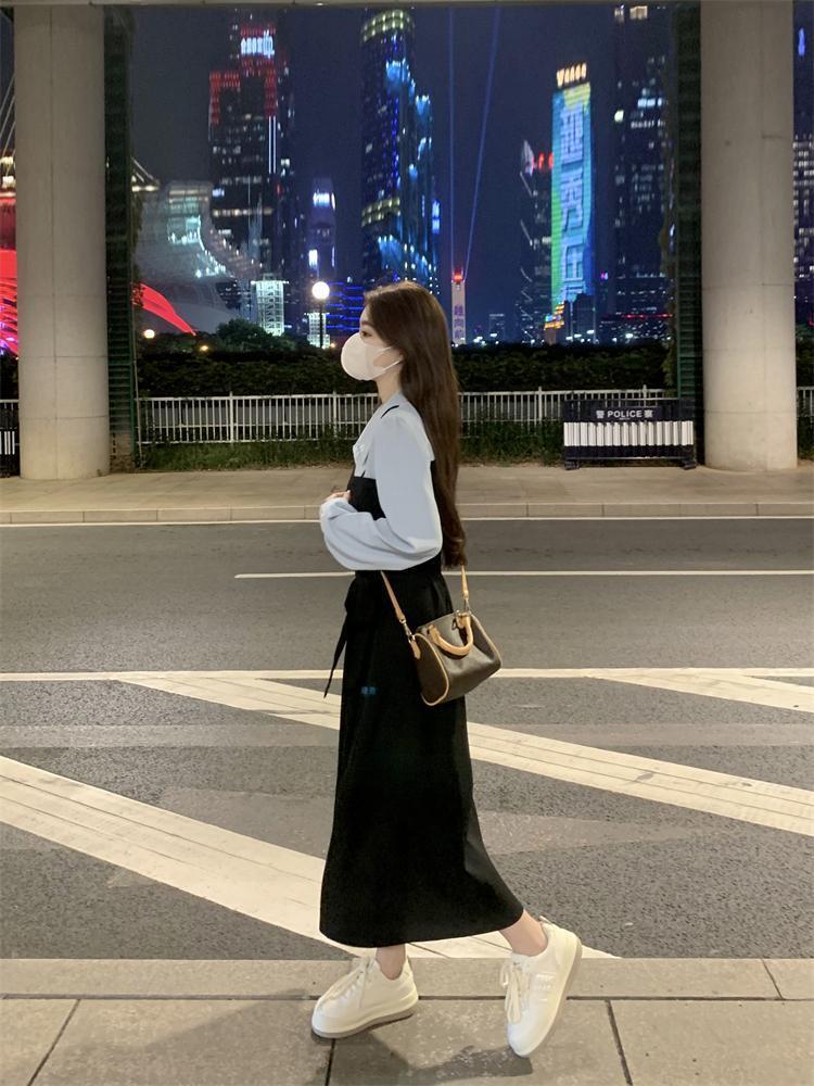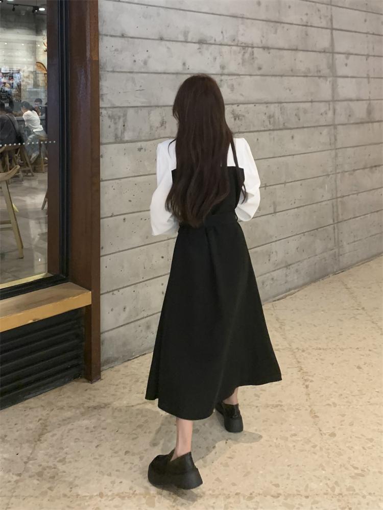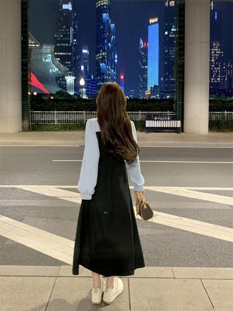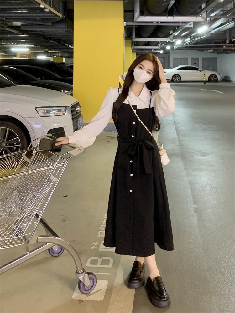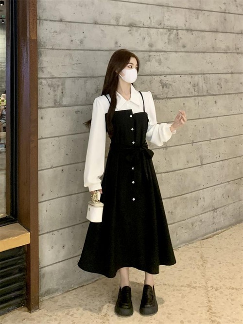 まるでブラウスとジャンパースカートを重ね着しているような、フェイクツーピースのロングワンピースです。