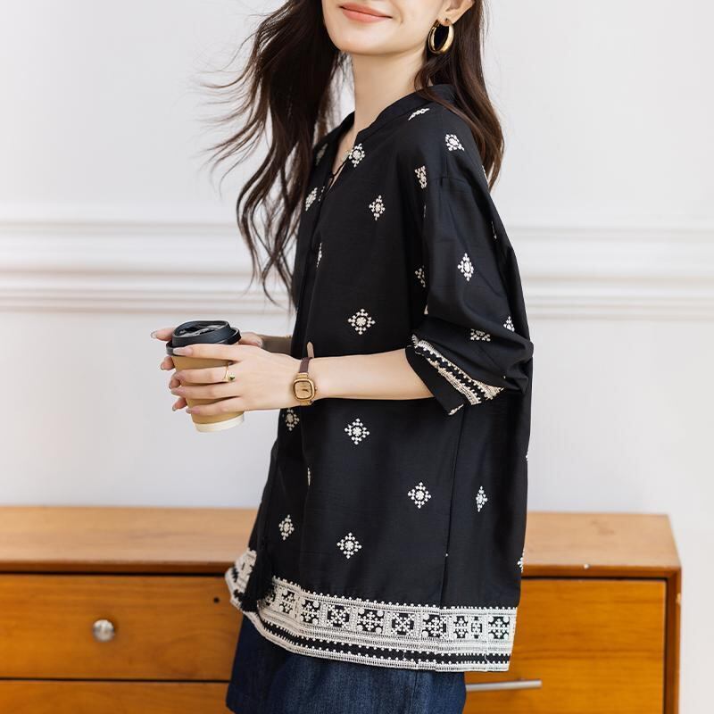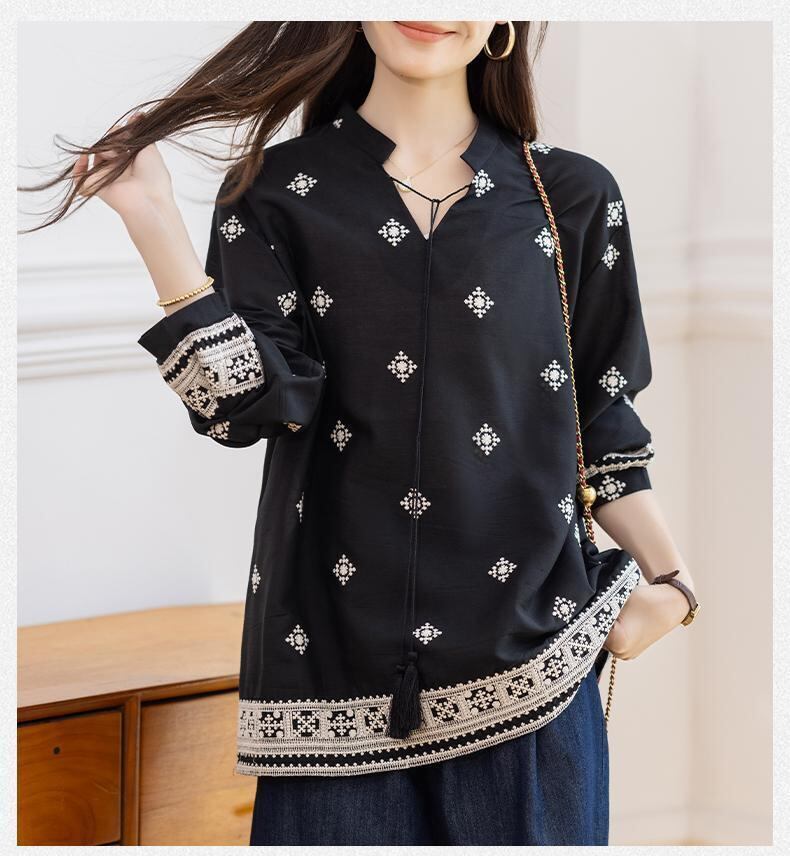 新品大きいサイズ花柄刺繍Vネック長袖レトロプルオーバートップス秋冬