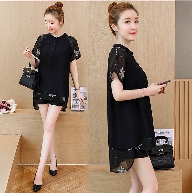L~大きいサイズ レディース バンドカラーシフォン重ね着風トップス 半袖 五分袖 春夏
