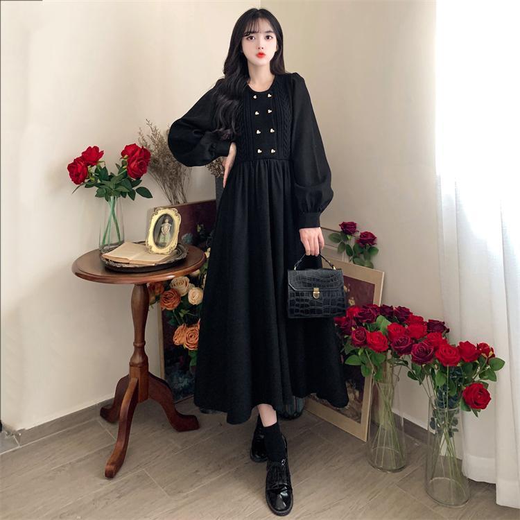 新品 大きいサイズ 4L Aラインワンピース ロング丈 ハートボタン 秋 冬 ブラック XXL(3L)