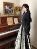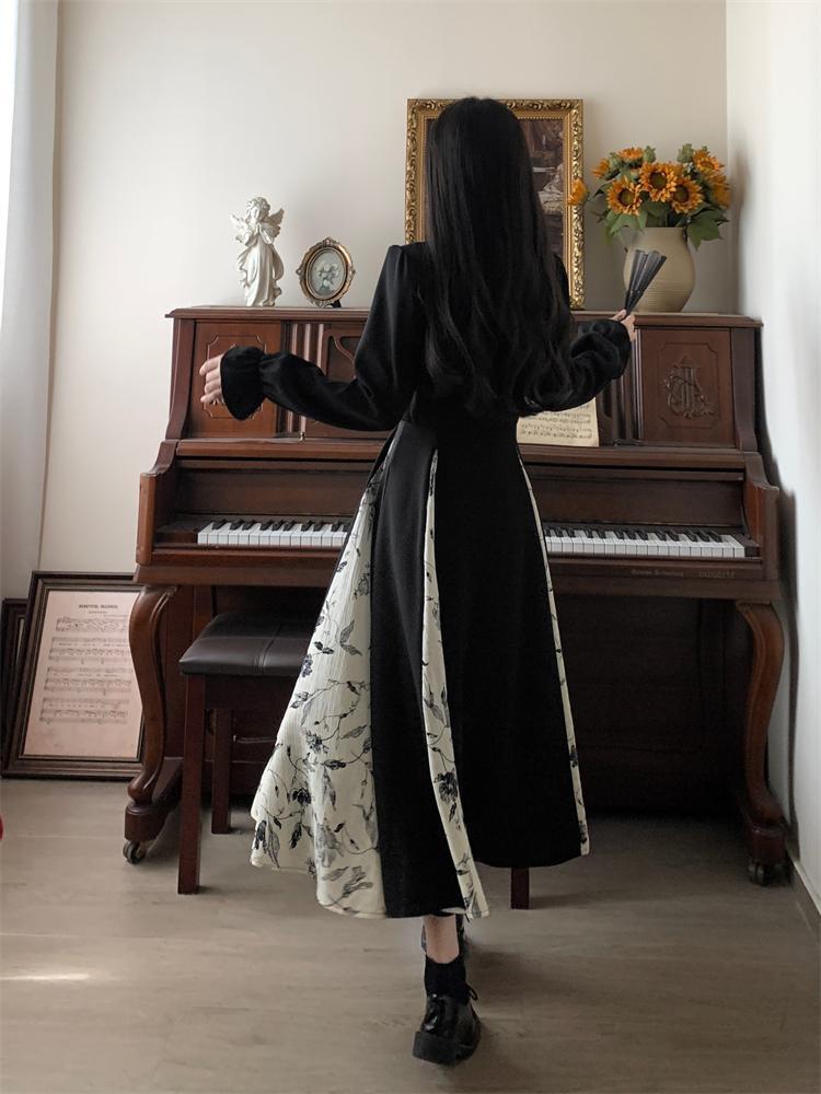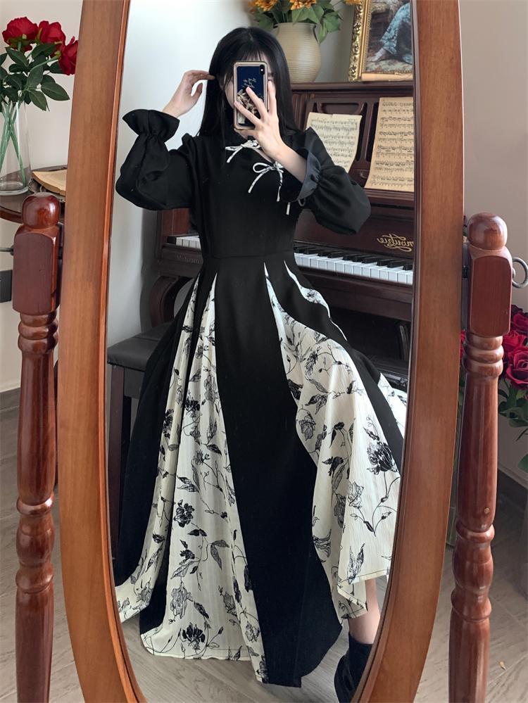 新品 大きいサイズ 3L Aラインワンピース ロング丈 花柄 春 黒レトロ長袖秋冬