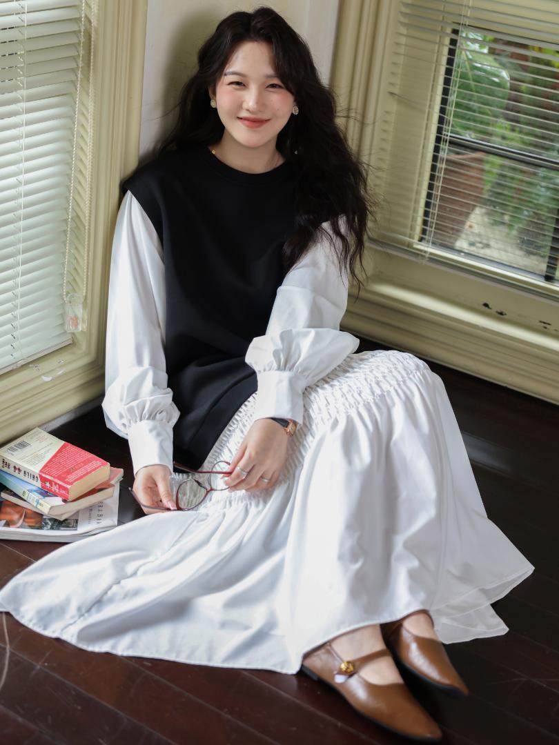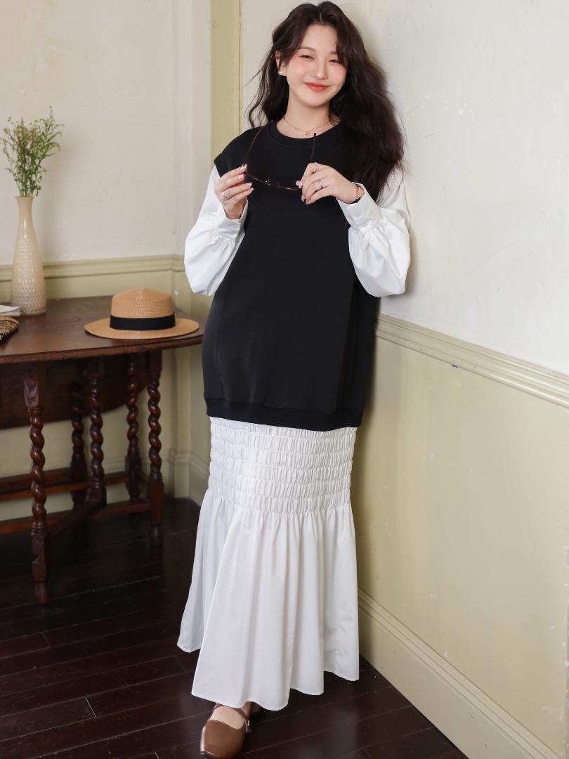 新品 大きいサイズ 4Lワンピース 秋冬 ロングワンピース ドッキング重ね着風 ゆったり レイヤード 着痩せ