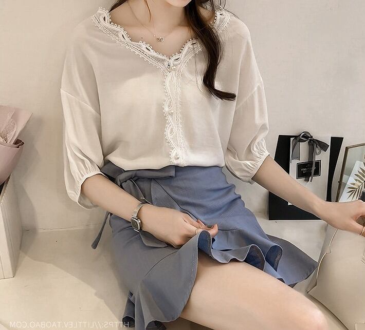 M~大きいサイズ レディース ケミカルレースVネックパールボタントップス シフォン 五分袖 春夏 【S8858097】