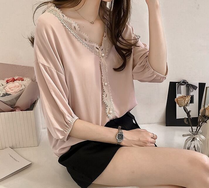 M~大きいサイズ レディース ケミカルレースVネックパールボタントップス シフォン 五分袖 春夏