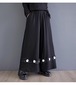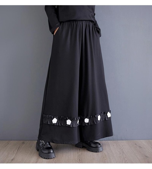 トップスとパンツの裾にあしらわれた立体的な花柄のフリルが、シンプルながらも個性的な魅力を引き立てます。