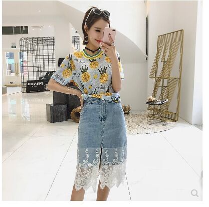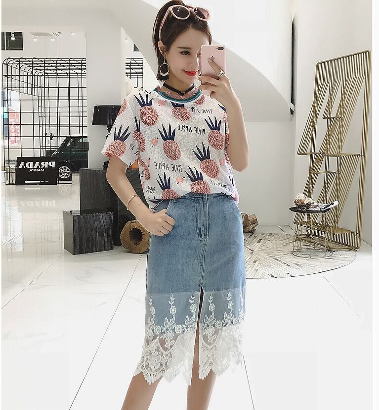 大きいサイズ レディース パイナップル柄トップス&裾レースデニムスカート2点セット 上下セット セットアップ 半袖 五分袖 春夏