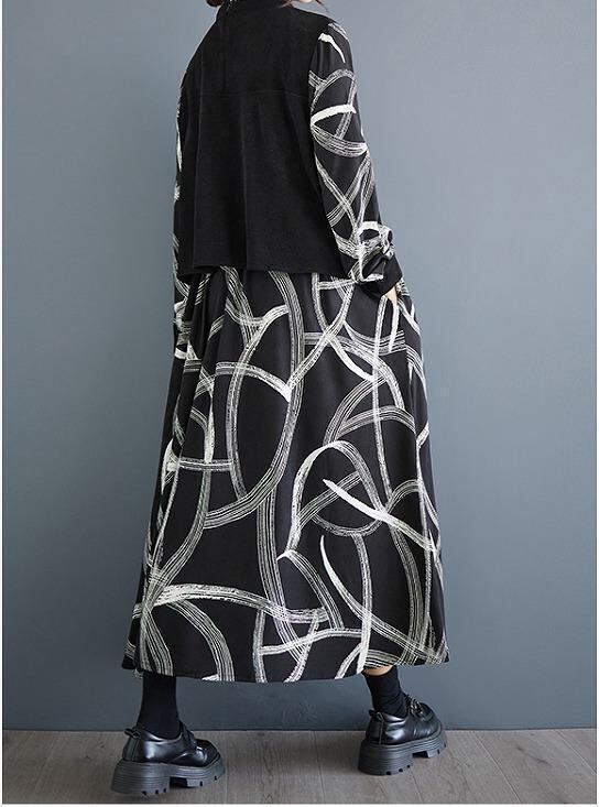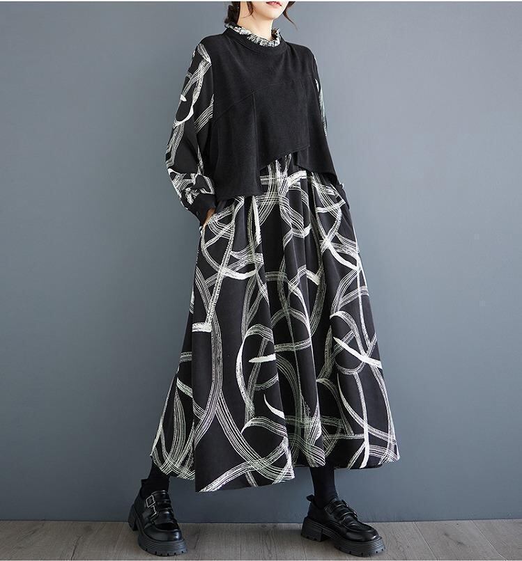 新品 大きいサイズ ゆったり ロングワンピース 秋冬 黒 プリント おしゃれ Aライン マキシ丈