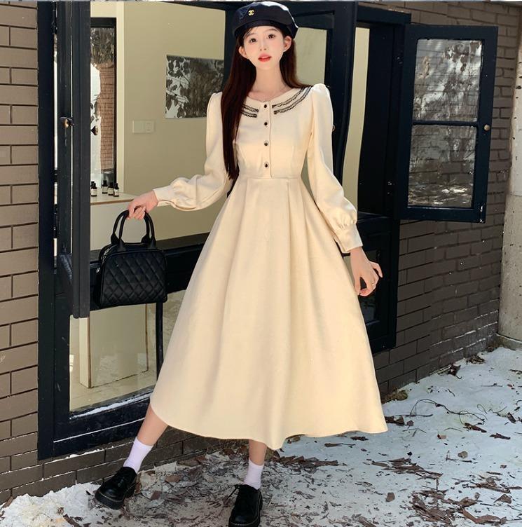 気品あふれるクラシックなデザインが特徴の、長袖 Aラインワンピースです。ヘップバーン風のエレガントな雰囲気で、パフスリーブとラウンドネックが顔周りを華やかに見せます。オフホワイトの上品な色味と無地のデザインは、日常から結婚式、年次総会などのパーティーシーンまで幅広く活躍します。