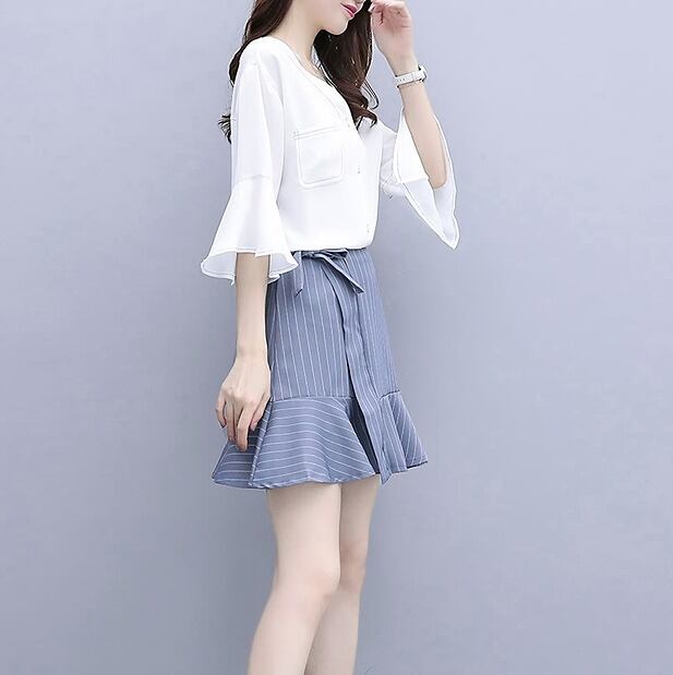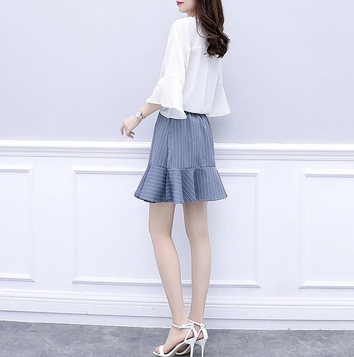 L~大きいサイズ レディース Vネックフリルスリーブブラウス&ピンストライプ柄裾フリルラップミニスカート 2点セット 上下セット セットアップ 七分袖 春夏 【S8883027】