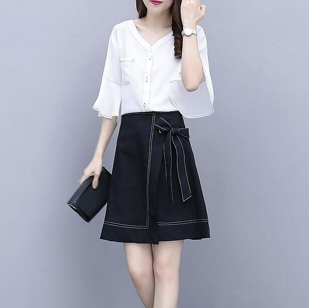 L~大きいサイズ レディース Vネックフリルスリーブブラウス&ホワイトステッチラップミニスカート 2点セット 上下セット セットアップ 七分袖 春夏
