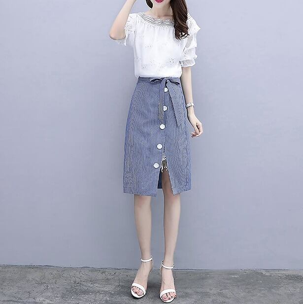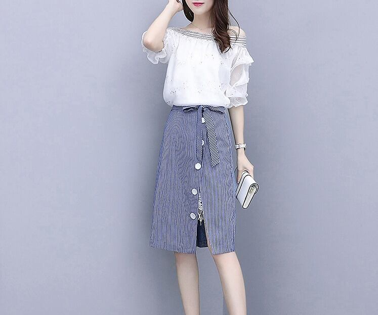L~大きいサイズ レディース オフショルティアードスリーブトップス&ピンストライプ柄重ね着風ラップスカート 2点セット 上下セット セットアップ 五分袖 春夏 【S8825027】