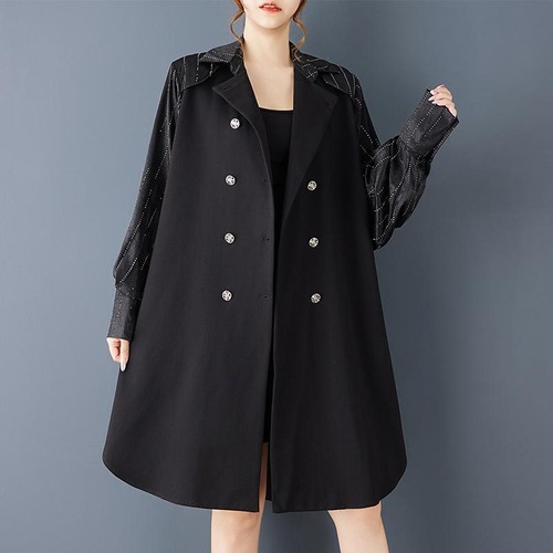 袖の個性的な切り替えデザイン(スプライシング)が目を引く、ゆったりとしたミドル丈のトレンチコート(スーツドレスジャケット)です。本体はハリのある黒の生地、袖はドットやラインのような装飾が施されたシアー感のある素材が使用されており、ダークな雰囲気ながらも軽やかさがあります。