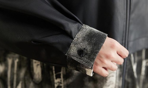 スタンドカラーとゆったりとしたシルエットが特徴の、ミドル丈ウィンドブレーカー(ジャケット)です。肩から袖にかけてPUレザー(合成皮革)が切り替え(ステッチ)られており、カジュアルな中にもモードな要素が加わったデザインです。