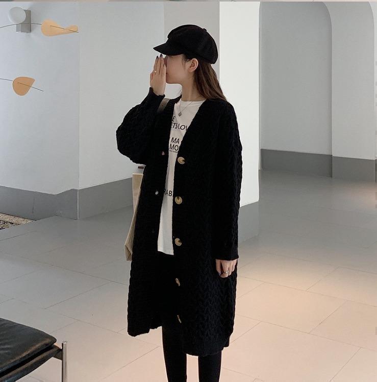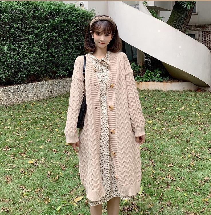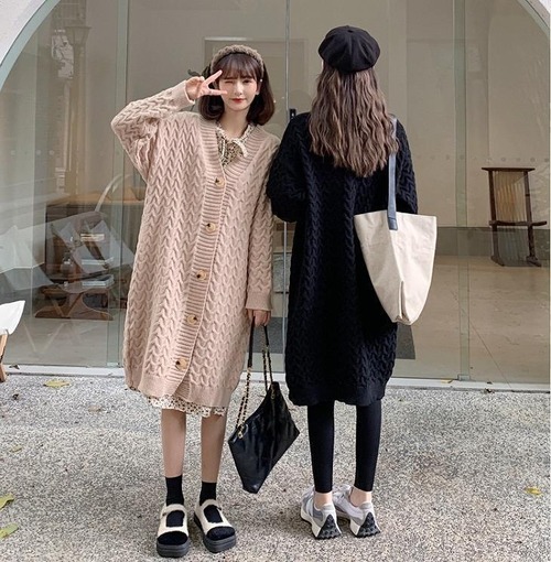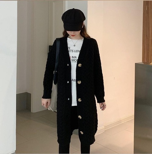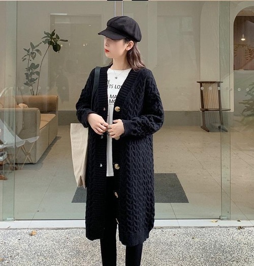 ミドル丈で羽織りやすい、長袖のニットカーディガンです。韓国版のゆったりとしたデザインで、気になる体型をカバーしつつ、リラックス感のある着心地が魅力です。