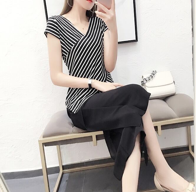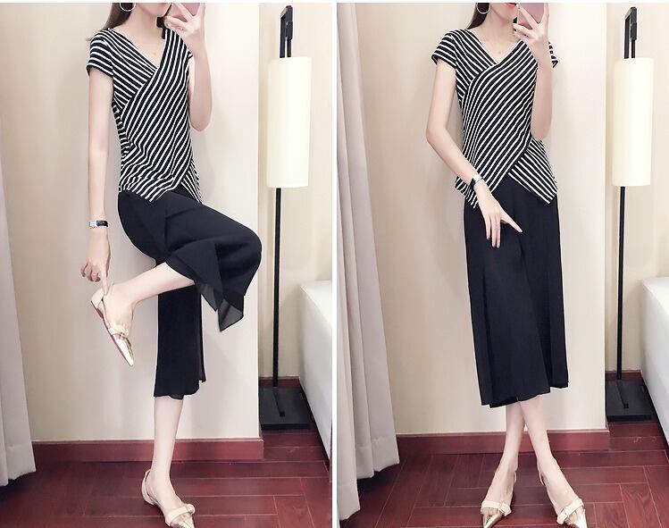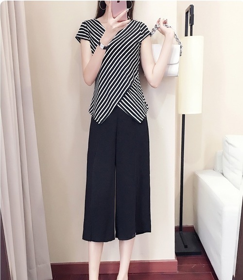 大きいサイズ レディース ストライプ柄クロスデザイントップス&七分丈ワイドパンツ 2点セット 上下セット セットアップ 半袖 春夏 【S8852317】