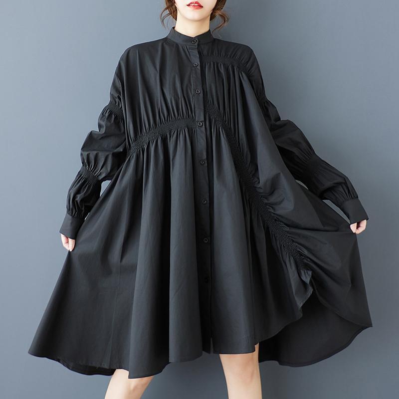 新品 プリーツ シャツワンピース 黒 レトロ ゆったり ミディ丈 秋冬 長袖